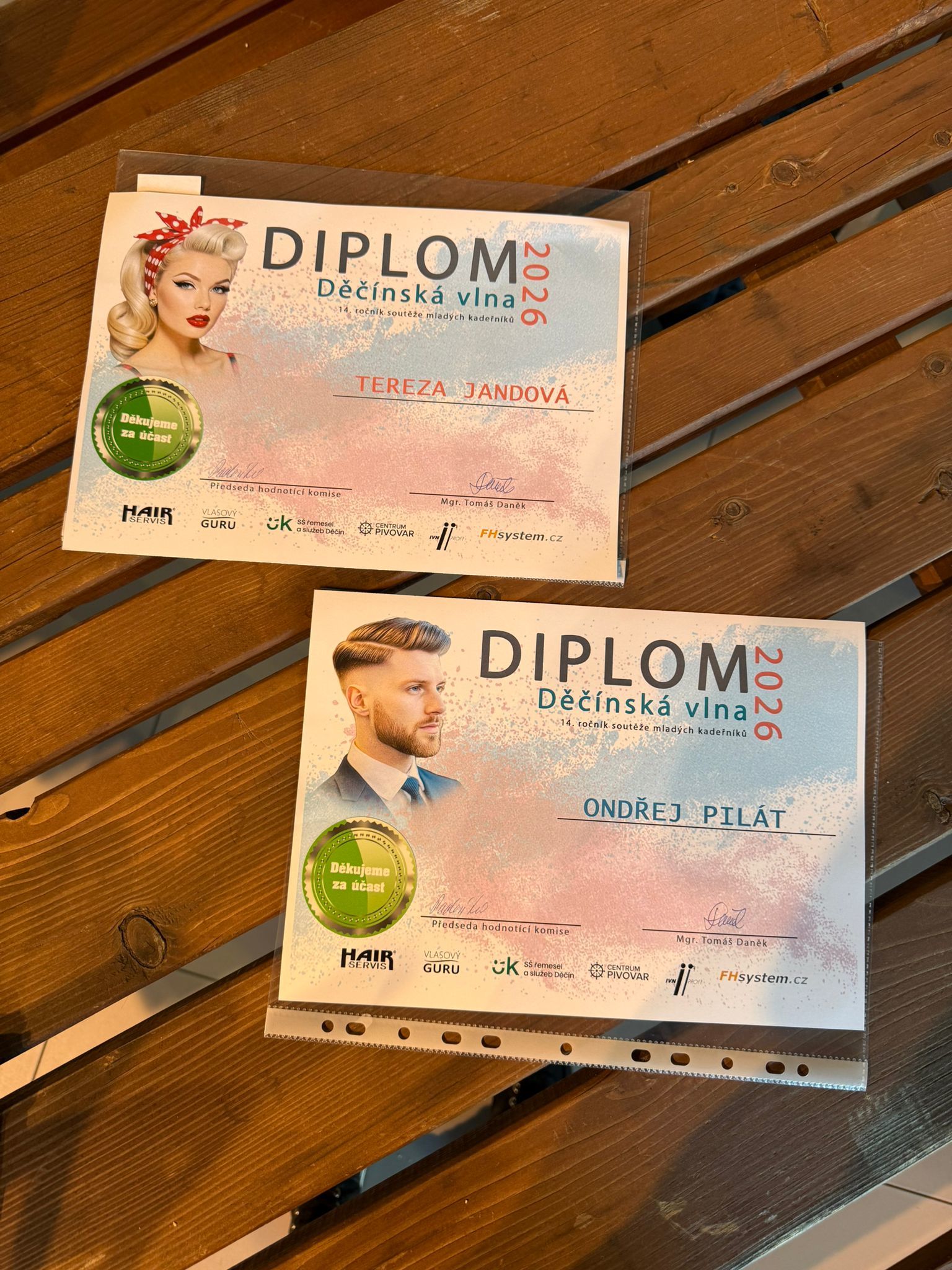 Dne 23. dubna se naši talentovaní žáci 2. ročníku oboru kadeřník, Tereza Jandová a Ondřej Pilát, zúčastnili prestižního 14. ročníku kadeřnické soutěže Děčínská vlna. V silné konkurenci předvedli svou kreativitu, preciznost i cit pro detail v kategoriích dámské Pin-up a pánské Gentleman 2026.