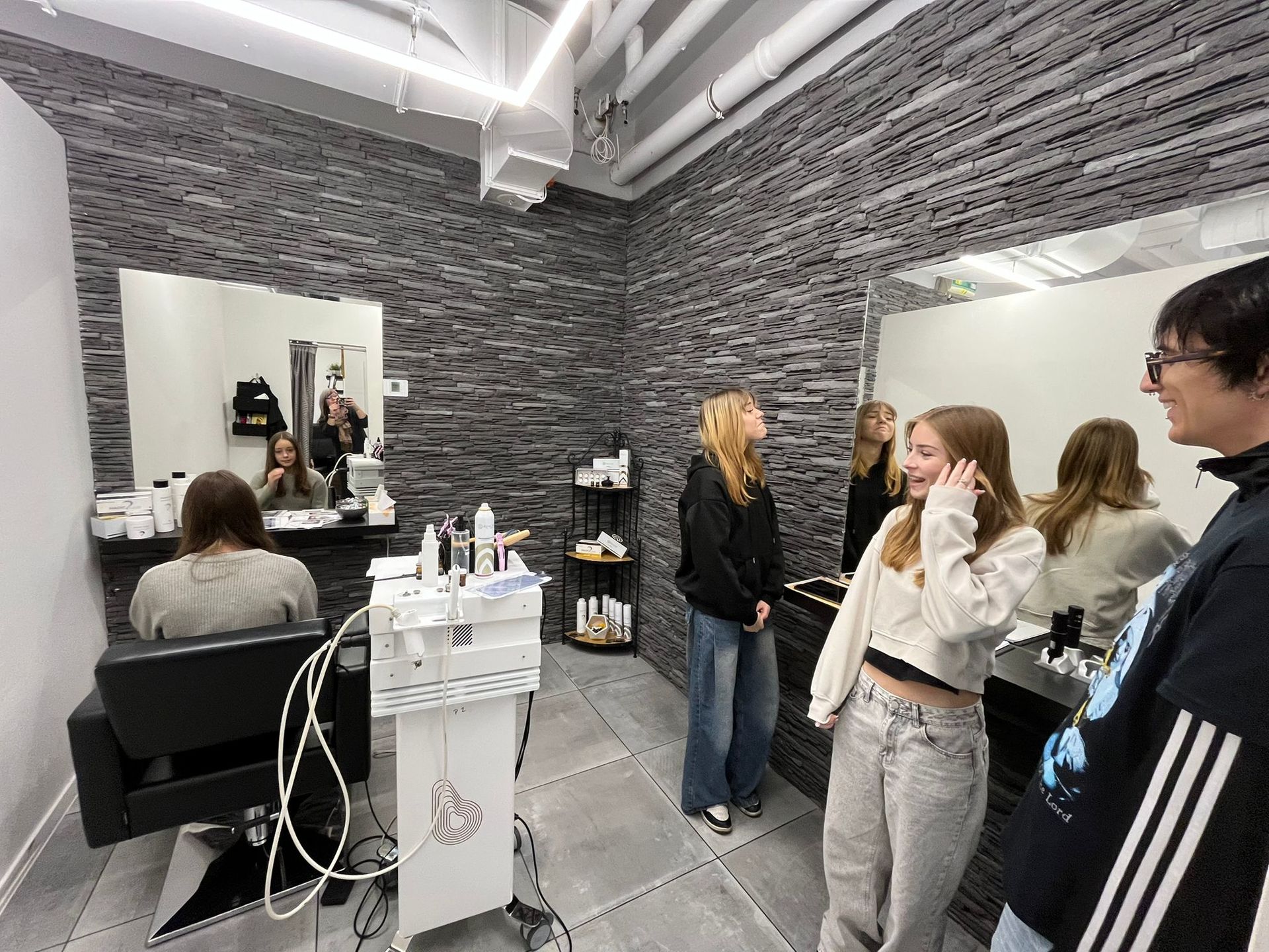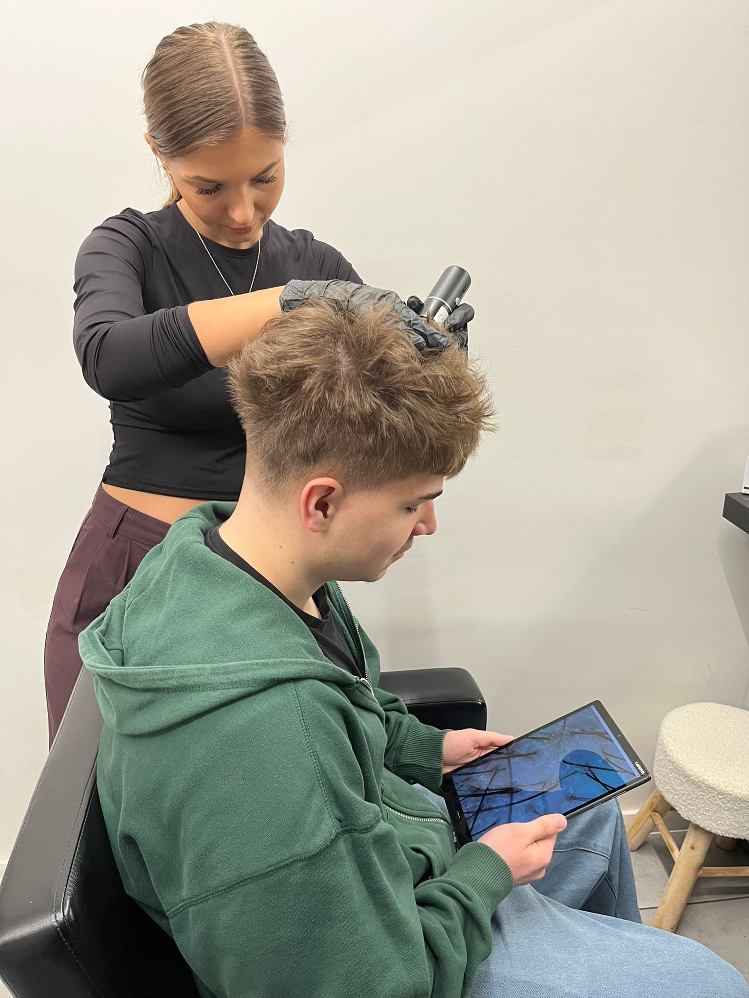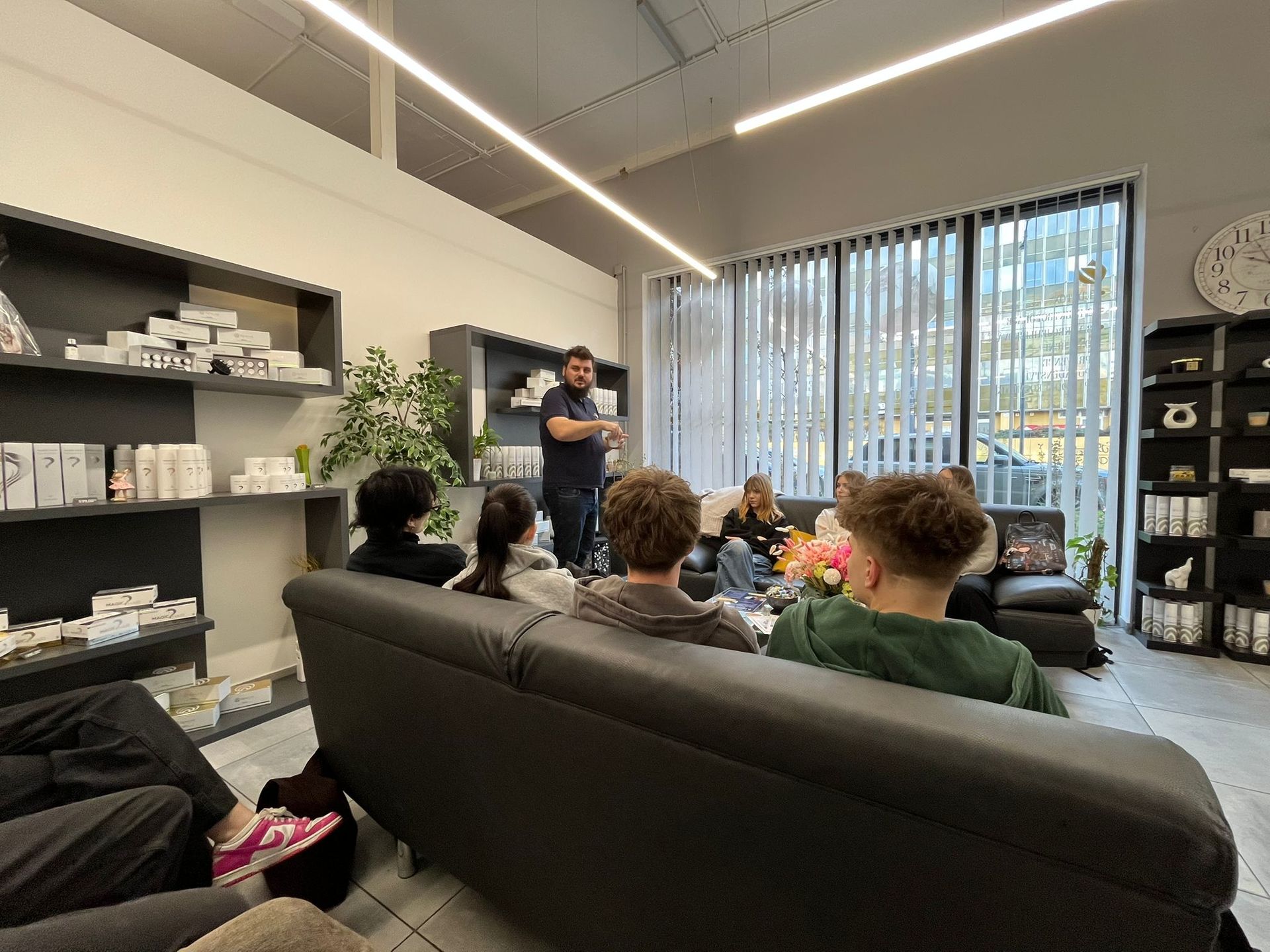 Po příchodu nás přivítal pan majitel, který žákům představil kliniku i její služby a přiblížil postupy práce se zákazníkem. Vysvětlil také, jak probíhá odborné poradenství při potížích s vlasovou pokožkou.