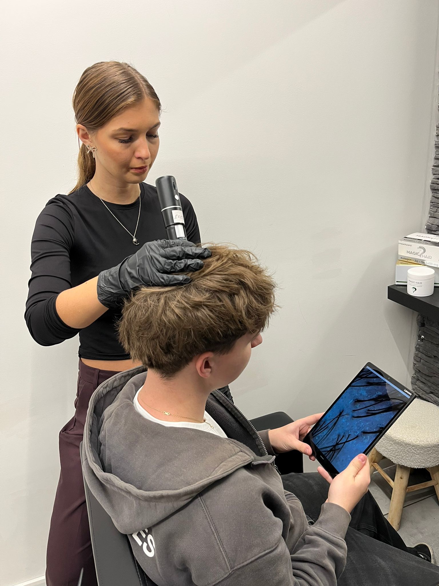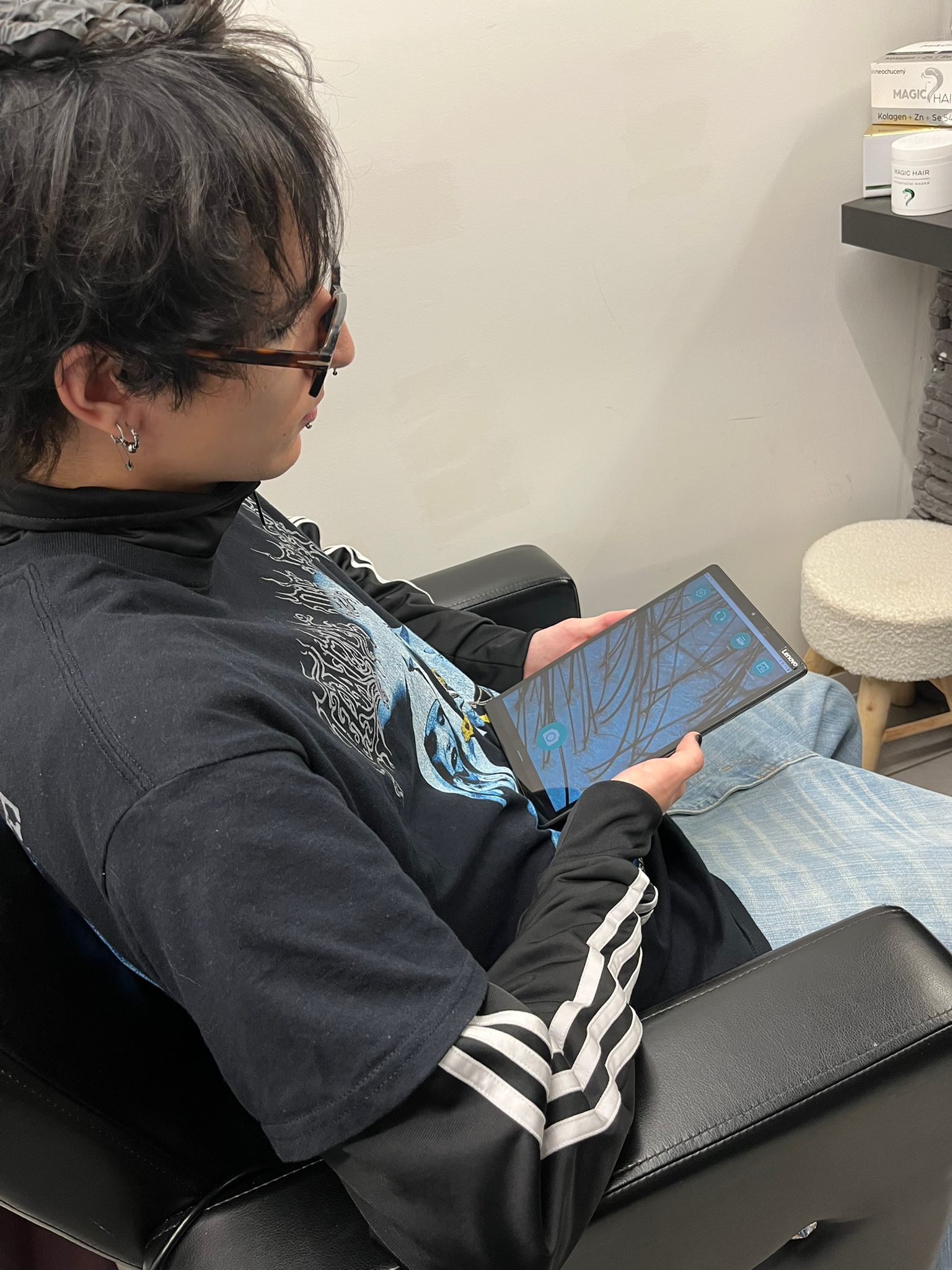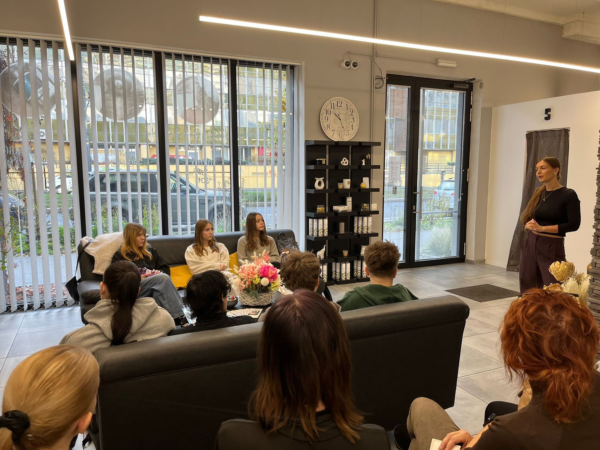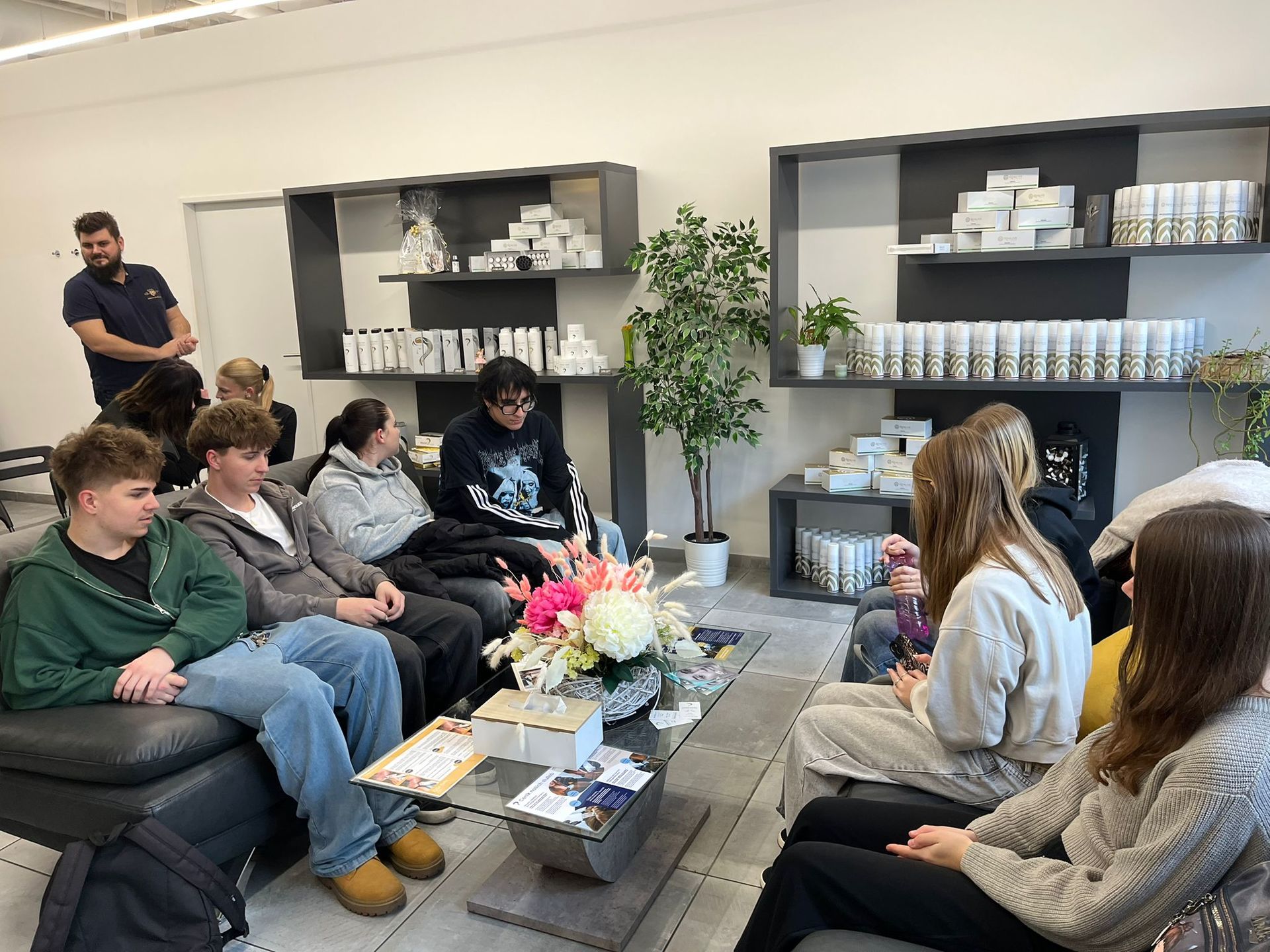 Po příchodu nás přivítal pan majitel, který žákům představil kliniku i její služby a přiblížil postupy práce se zákazníkem. Vysvětlil také, jak probíhá odborné poradenství při potížích s vlasovou pokožkou.