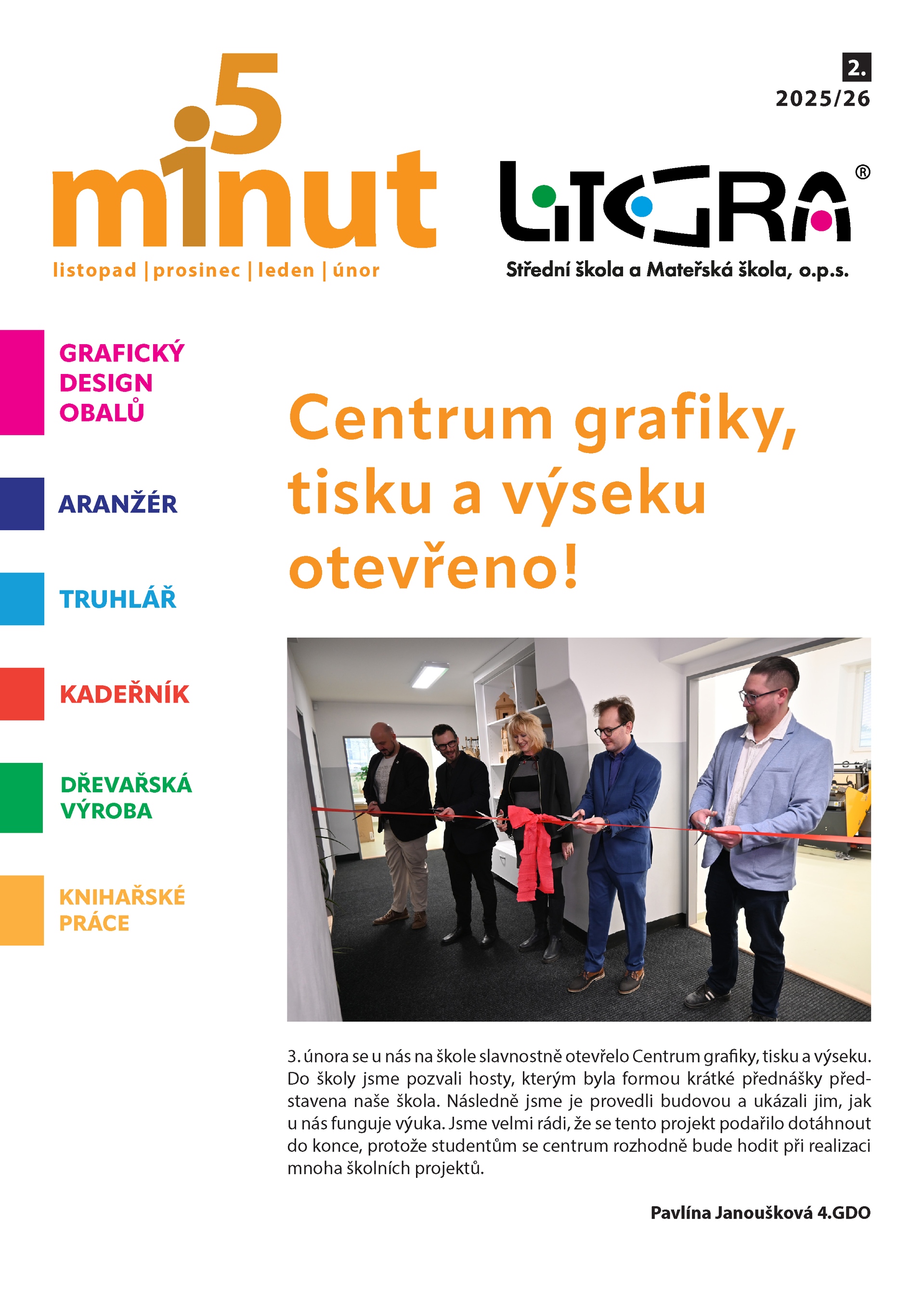 15minut je školní časopis, který mapuje dění na naší škole v průběhu roku. Najdete v něm články o školních akcích, exkurzích, soutěžích i každodenním životě v jednotlivých oborech. Vychází čtyřikrát ročně a každé číslo zachycuje atmosféru školy z trochu jiné perspektivy.